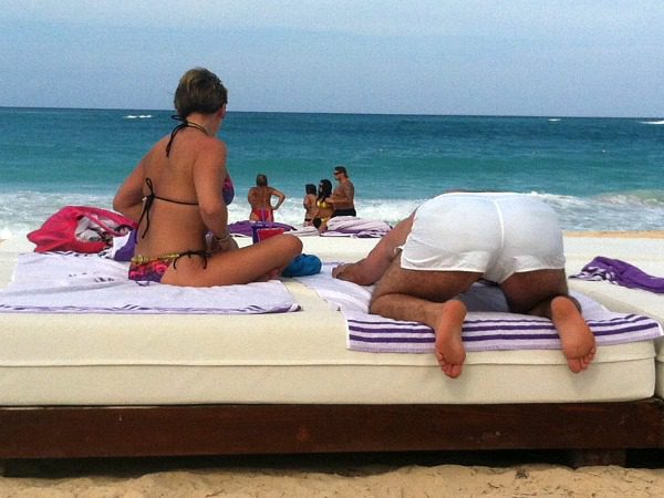I don’t normally take pictures of people without either asking permission or them knowing it. The exception was when the IBMer and I took a girls-only vacation to Punta Cana last year. It was there I witnessed several disturbing things you just don’t want to see – beach no no’s if you will. First there was a pandemic of Russians wearing speedos. Followed by loads of ladies north of 60 going topless. I like to think I’m pretty tolerant of cultural differences, so that didn’t bother me too much, but this did:
