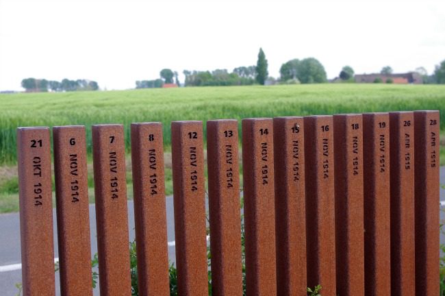From the Lijssenthoek Military Cemetery visitor’s centre to the actual cemetery, you pass by iron posts hammered into the ground with numbers and dates engraved upon them. These represent the number of burials per day starting in Oct. 1914.