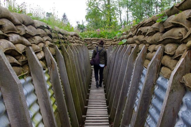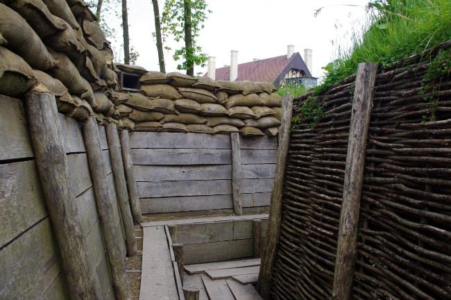 Over 750 km. of trenches carved the western front, and at Memorial Museum Passchendaele, visitors can walk through replicas. These zig zagging mazes were constructed differently depending on the country that made them. The Germans lined theirs with sacks, the Brits with corrugated metal. All were topped with sand bags.