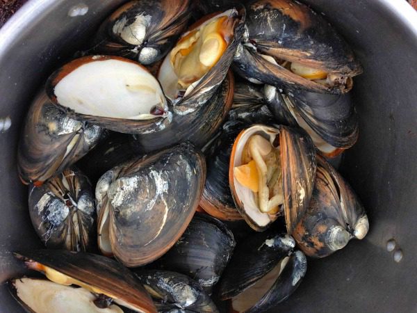 Though it’s only 10 a.m., it’s the perfect time for a clam bake. Who knew clamming could be such a ravenous activity? The bar clams are thrown into a large pot of boiling seawater. After approximately 18 minutes, the shells hinge open, releasing their own juices, and the pot is removed from the propane burner.