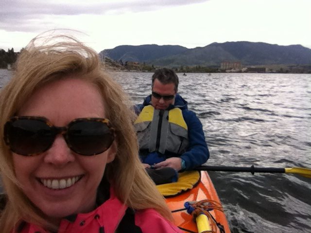 Kayaks are great, because you can store so many things (like jackets and bottles of wine) inside them.Here I am about to start out on the shores of Lake Okanagan, in Penticton. After a brief instruction we were on our way. It was relatively easy, but definitely an arm workout.